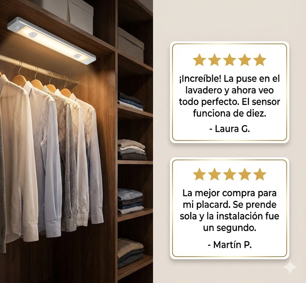 Olvidate de andar buscando interruptores o prendiendo luces grandes para todo. Esta barra detecta tu movimiento y se activa sola, justo cuando la necesitás.